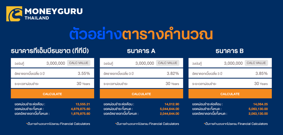 เมื่อคำนวณแล้วกรณีที่เลือกผ่อนกับธนาคารทีเอ็มบีธนชาต (ทีทีบี) ที่อัตราดอกเบี้ยเฉลี่ย 3 ปีแรกอยู่ที่ 3.55% จะเสียดอกเบี้ยทั้งหมด 1,879,875.60 บาท ซึ่งประหยัดดอกเบี้ยกว่าการผ่อนกับธนาคาร A 164,768.40  บาท และประหยัดดอกเบี้ยกว่าการผ่อนกับธนาคาร B 183,254.40 บาท