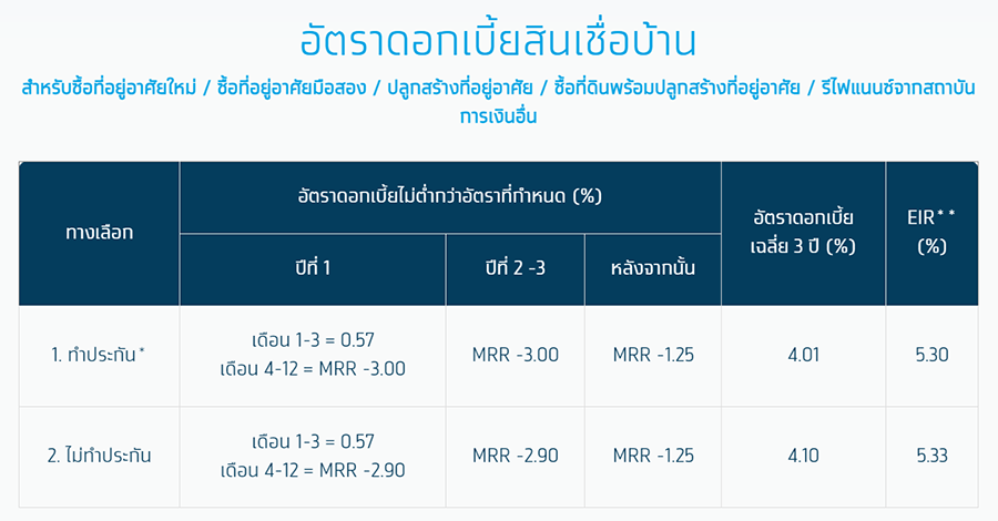 - อัตราดอกเบี้ยแบบลอยตัว ตั้งแต่เดือนที่ 4 จนถึงตลอดอายุสัญญา โดยอ้างอิงตามอัตราดอกเบี้ย MRR ตามประกาศของธนาคาร
