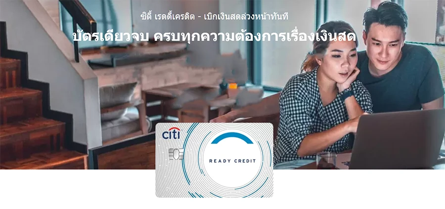 สมัครบัตรกดเงินสดซิตี้ เรดดี้เครดิตได้เงินสดด่วน ไม่ต้องรออนุมัติสินเชื่อ เพื่อเป็นเงินสดสำรองฉุกเฉินใช้จ่ายส่วนตัว ซ่อมแซมบ้าน ท่องเที่ยว หรือ แต่งงาน กดเงินสดไม่มีค่าธรรมเนียม หรือ เปลี่ยนวงเงินในบัตรให้เป็นเงินก้อนโอนเข้าบัญชีธนาคาร อนุมัติวงเงินสูงสุด 5 เท่าของรายได้ ดอกเบี้ยต่ำ แบ่งชำระรายเดือนสูงสุด 48 เดือน