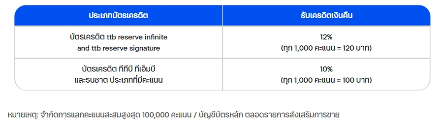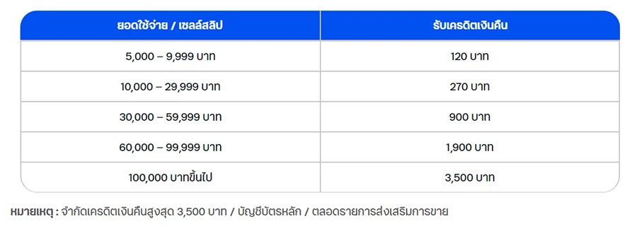 ต่อที่ 2 : แลกคะแนนรับเครดิตเงินคืนสูงสุด 12% เมื่อใช้คะแนนสะสมทุก 1,000 คะแนน เมื่อใช้จ่าย 1,000 บาทขึ้นไป/เซลล์สลิปและแลกคะแนนสะสมทุก 1,000 คะแนน โดยไม่เกินยอดใช้จ่าย