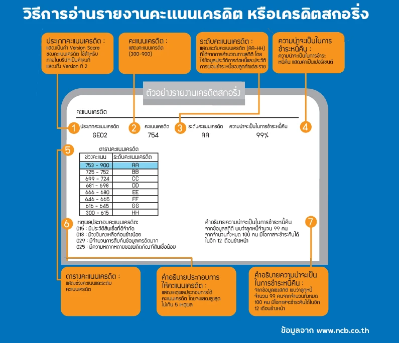 และมีวิธีการอ่านรายงานคะแนนเครดิต หรือเครดิตสกอริ่ง โดยมีข้อมูลตั้งแต่ ประเภทของคะแนนเครดิต, คะแนนเครดิต (300 - 900), ระดับคะแนนเครดิต (AA - HH), ความน่าจะเป็นในการชำระหนี้ที่ได้จากการประมวลผลข้อมูล ซึ่งในรายงานก็จะมีคำอธิบายการประมวลผลประกอบด้วย ดังนี้