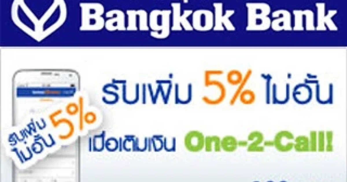 รับโบนัสเพิ่ม 5% ไม่อั้น เมื่อเติมเงินมือถือ One-2-Call! 100 บาท ผ่านบัวหลวง ไอแบงก์กิ้ง หรือบัวหลวง เอ็มแบงก์กิ้ง