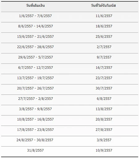 - โบนัสเพิ่ม 5% จะถูกเติมให้กับหมายเลขโทรศัพท์มือถือที่เติมเงินในทุกวันพุธถัดไป กำหนดการได้รับโบนัส ดังตารางด้านล่าง