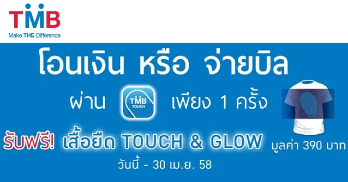 พิเศษ...รับฟรี! เสื้อยืด TOUCH & GLOW เมื่อเปิดบัญชี พร้อมบัตรเดบิต ทีเอ็มบี และทำธุรกรรม โอนเงิน หรือจ่ายบิล หรือเติมเงิน อย่างใดอย่างหนึ่ง เพียง 1 ครั้ง ผ่าน TMB TOUCH Mobile Application ภายใน 30 วัน หลังจากวันที่เปิดบัญชี