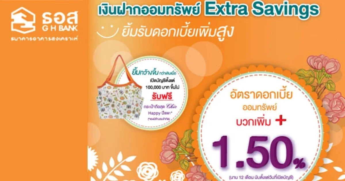 เงินฝากออมทรัพย์ Extra Savings รับดอกเบี้ยออมทรัพย์บวกเพิ่ม 1.50% ต่อปี จากธนาคารอาคารสงเคราะห์