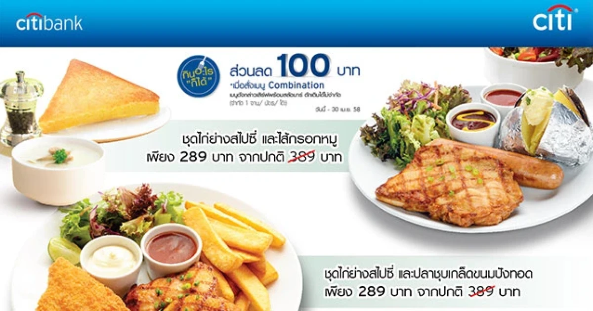 บัตรเครดิตซิตี้แบงก์ เอาใจสมาชิกบัตร โดยร่วมมือกับร้านอาหารซิซซ์เล่อร์ (Sizzler) มอบสิทธิพิเศษสำหรับสมาชิกบัตรซิตี้แบงก์ที่ชื่นชอบอาหารประเภทสเต็ก ซีฟู้ด และสลัดสไตล์ตะวันตก ให้ได้อิ่มอร่อยสุดคุ้มกับแคมเปญ "กินอะไรก็ได้" พร้อมรับส่วนลด 100 บาททันที!! เมื่อสั่งเมนู Combination 2 เมนูสุดฮิต ชุดไก่ย่างสไปซี่และไส้กรอกรวมหมู หรือ ชุดไก่ย่างสไปซี่และปลาชุบเกล็ดขนมปังทอด โดยเมนูดังกล่าวจะเสิร์ฟพร้อมสลัดบาร์ซึ่งตักและเติมได้ไม่จำกัด ในราคา 289 บาท จากปกติ 389 บาท (จำกัด 1 จาน / บัตร / โต๊ะ) ที่ซิซซ์เล่อร์ ทุกสาขา
