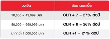 หมายเหตุ : อัตราดอกเบี้ยสินเชื่อบุคคลรายย่อย (Consumer Loan Rate) CLR = 20% ต่อปี ตามประกาศธนาคารครั้งที่ 2/2557 - หากชำระคืนไม่ตรงตามเงื่อนไขที่ธนาคารกำหนด (ชำระล่าช้าหรือไม่ตรงตามวันที่กำหนด) ธนาคารจะปรับอัตราดอกเบี้ยเป็น 28% ต่อปี จนกว่าจะมีการชำระคืนตามเงื่อนไขที่ธนาคารกำหนด