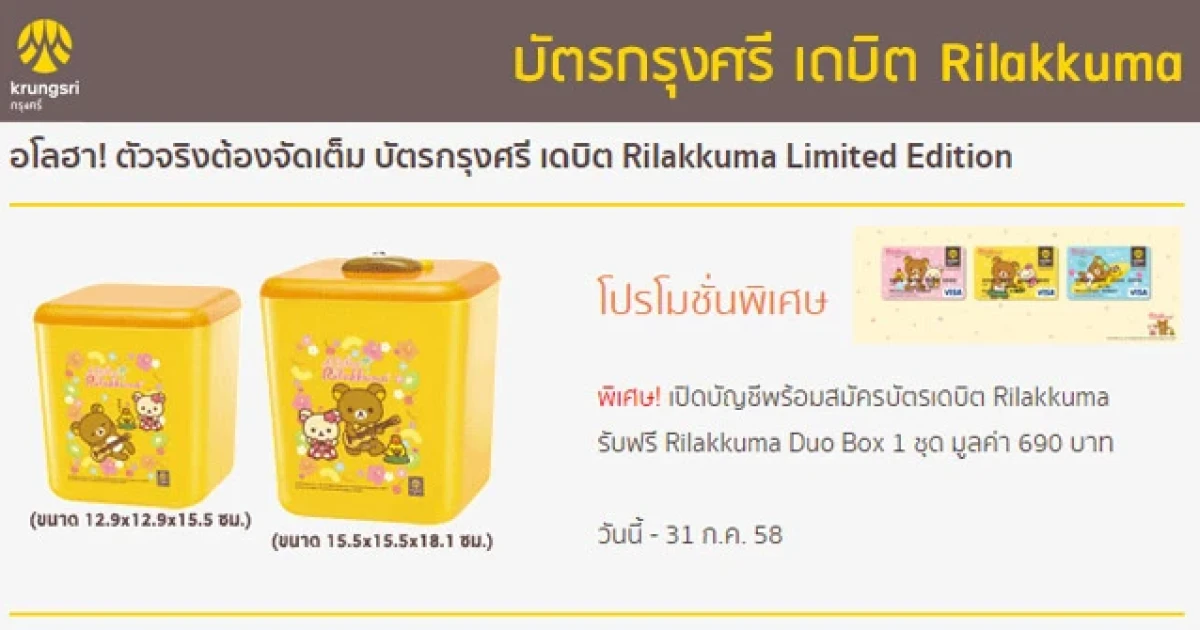 โปรโมชั่นพิเศษ! เปิดบัญชีพร้อมสมัครเดบิตกรุงศรี รับฟรี Rilakkuma Duo Box 1 ชุด