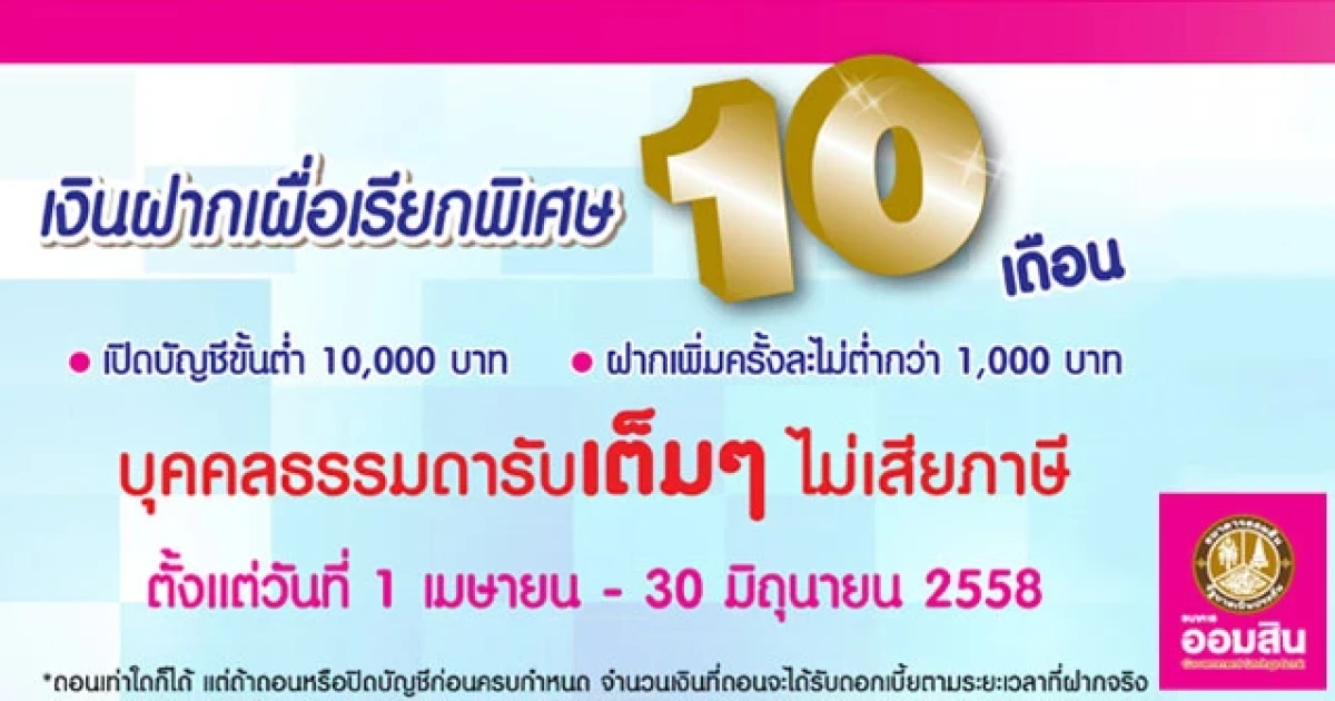 บัญชีเงินฝากเผื่อเรียกพิเศษ 10 เดือน : เป็นบัญชีสำหรับลูกค้าบุคคลธรรมดาอายุตั้งแต่ 7 ปีบริบูรณ์ขึ้นไป และนิติบุคคลทุกประเภท เปิดบัญชีขั้นต่ำ 10,000 บาท รับดอกเบี้ยสูงถึง 7.50% ในเดือนสุดท้าย