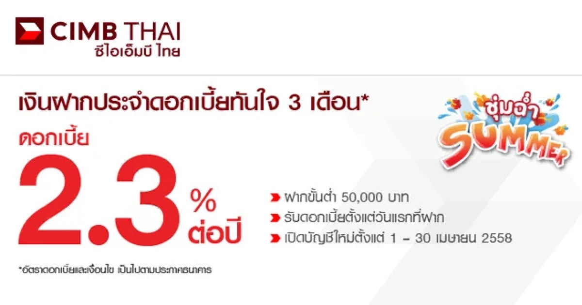 ชุ่มฉ่ำซัมเมอร์ กับเงินฝากประจำดอกเบี้ยทันใจ 3 เดือน ดอกเบี้ย 2.30% ต่อปี จาก CIMB Thai