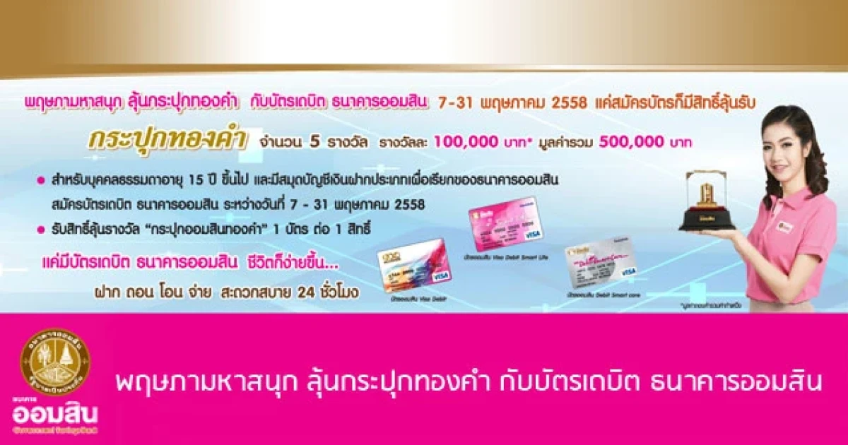 แค่มีบัตรเดบิต ธนาคารออมสิน ชีวิตก็ง่ายขึ้น ... ไม่ว่าจะฝาก ถอน โอน จ่ายเงิน สะดวกสบาย ตลอด 24 ชั่วโมง พร้อมสิทธิ์ลุ้นรับ! กระปุกทองคำ จำนวน 5 รางวัล รางวัลละ 100,000 บาท* มูลค่ารวม 500,000 บาท 7 - 31 พฤษภาคม 2558 นี้