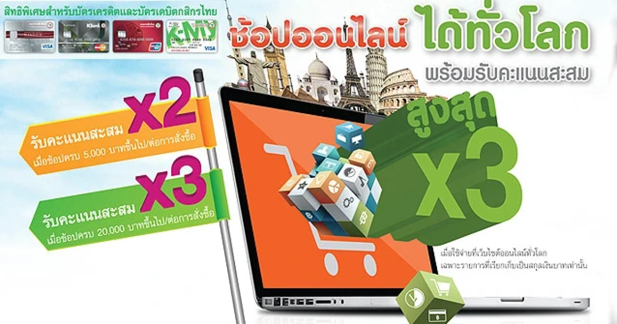 ช้อปออนไลน์ได้ทั่วโลก รับคะแนนสะสมสูงสุด X3 สิทธิพิเศษสำหรับบัตรเครดิตและบัตรเดบิตกสิกรไทย เมื่อใช้จ่ายที่เว็บไซต์ออนไลน์ทั่วโลก ครบตามยอดที่กำหนด เฉพาะรายการที่เรียกเก็บเป็นสกุลเงินบาทเท่านั้น