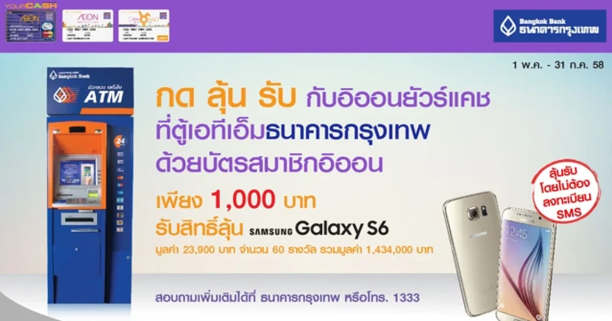กด ลุ้น รับ Samsung Galaxy S6 กับอิออนยัวร์แคช ที่ตู้เอทีเอ็มธนาคารกรุงเทพ ทุกสาขาทั่วไทย