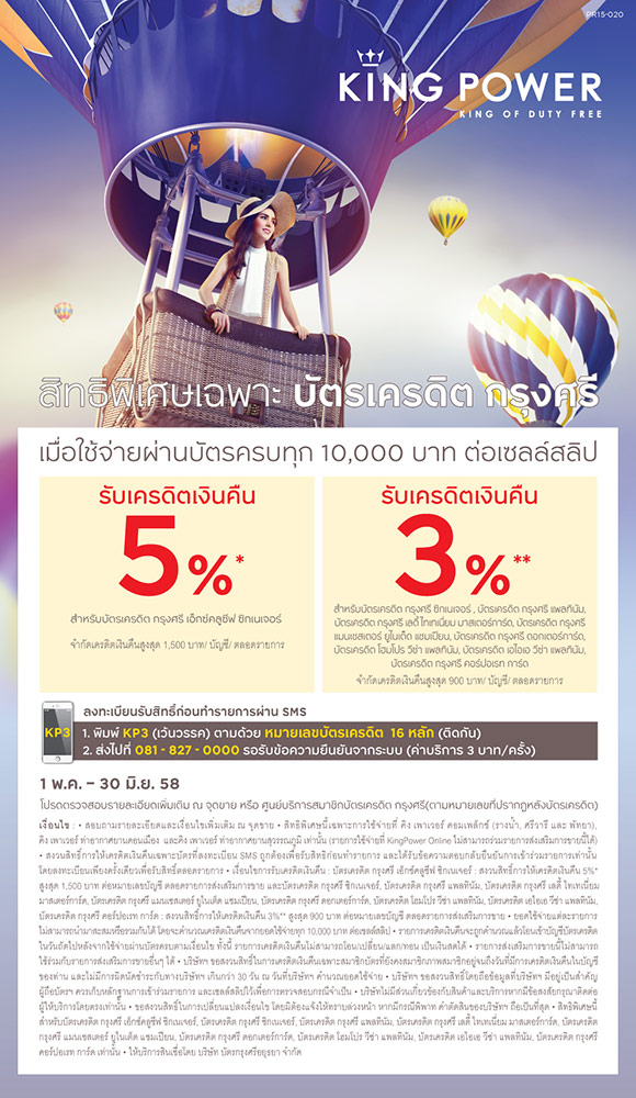 สิทธิพิเศษเฉพาะสมาชิกบัตรเครดิตกรุงศรี ช้อปที่ King Power รับเงินคืน 3-5% เพียงใช้จ่ายผ่านบัตรครบทุกๆ 10,000 บาท ต่อเซลล์สลิป