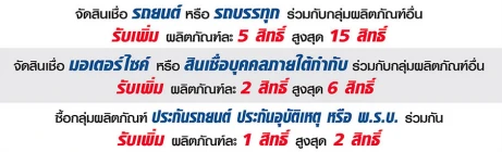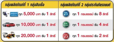 - สมัครสินเชื่อจำนำทะเบียนรถบรรทุก รถแทรคเตอร์ ที่ได้รับการอนุมัติสินเชื่อ และได้บันทึกสัญญาลงในระบบเรียบร้อยแล้วเท่านั้น โดยยอดวงเงินอนุมัติทุกๆ 20,000 บาท จะได้รับ 1 สิทธิ์ (เศษของ 20,000 บาท ไม่นำมาคำนวณ) และเมื่อสมัครร่วมกับประกันภัยรถยนต์ ประกันอุบัติเหตุส่วนบุคคล และ พ.ร.บ. จะได้รับสิทธิ์เพิ่มอีกผลิตภัณฑ์ละ 5 สิทธิ์