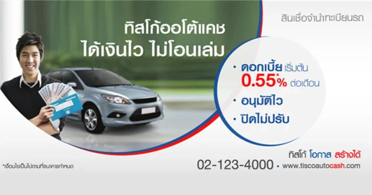"ทิสโก้ ออโต้ แคช" (TISCO AUTO CASH) : สินเชื่อรถยนต์สำหรับคนมีรถ อยากได้เงินสด ขับรถมาเลย เพียงนำทะเบียนรถมาขอสินเชื่อ รถแลกเงินเพื่อเพิ่มสภาพคล่องได้ทันที ด้วยอัตราดอกเบี้ยต่ำ เริ่มต้นเพียง 0.55% ต่อเดือน สูงสุดไม่เกิน 1.00% ต่อเดือน ขั้นตอนง่าย สะดวก รวดเร็ว ไม่ต้องจอดรถ ไม่ต้องโอนทะเบียน รับเงินไวภายใน 3 วันทำการ