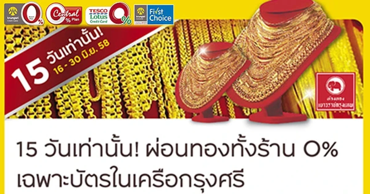 16 -30 มิ.ย. 58 เพียง 15 วันเท่านั้น ลูกค้าบัตรเครดิตในเครือกรุงศรี สามารถผ่อนทอง 0% ฟรีไม่มีค่าธรรมเนียมรูดบัตร ที่ห้างทองเยาวราชกรุงเทพ (โลโก้รูปช้าง) กว่า 150 สาขา (เฉพาะสาขาที่ร่วมรายการ)