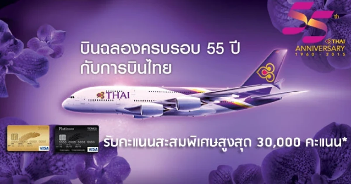 การบินไทยฉลองครบรอบ 55 ปี จองตั๋วผ่านบัตรฯ เทสโก้ โลตัส วีซ่า รับคะแนนสะสมพิเศษสูงสุด 30,000 คะแนน