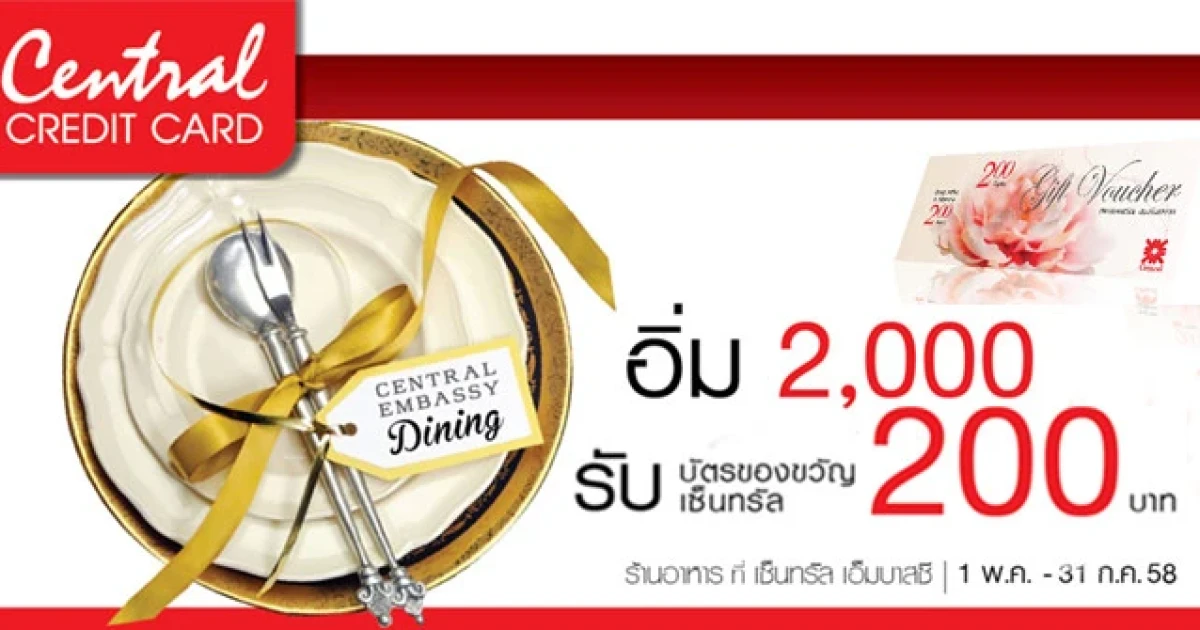 - สิทธิพิเศษเฉพาะการชำระด้วยเซ็นทรัล เครดิตคาร์ด ที่มีเครื่องหมายมาสเตอร์การ์ด และสำหรับการใช้จ่ายในร้านอาหาร ภายในศูนย์การค้าเซ็นทรัล เอ็มบาสซี่ ตั้งแต่ 2,000 บาท/ เซลล์สลิป (ไม่สามารถสะสมยอดจากหลายเซลล์สลิป)