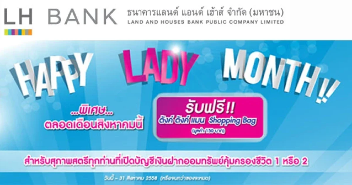HAPPY LADY MONTH พิเศษ! ตลอดเดือนสิงหาคมนี้ รับฟรี! "ตังค์ ตังค์ แมน Shopping Bag" มูลค่า 150 บาท สำหรับสุภาพสตรีทุกท่านที่เปิดบัญชีเงินฝากออมทรัพย์คุ้มครองชีวิต 1 หรือ 2 ตั้งแต่วันนี้ - 31 ส.ค. 2558 (หรือจนกว่าของจะหมด)