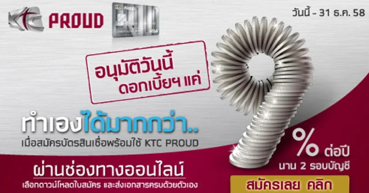 สมัครสินเชื่อ KTC PROUD ผ่านช่องทางออนไลน์ อนุมัติวันนี้ ดอกเบี้ยแค่ 9% ต่อปี นาน 2 รอบบัญชี