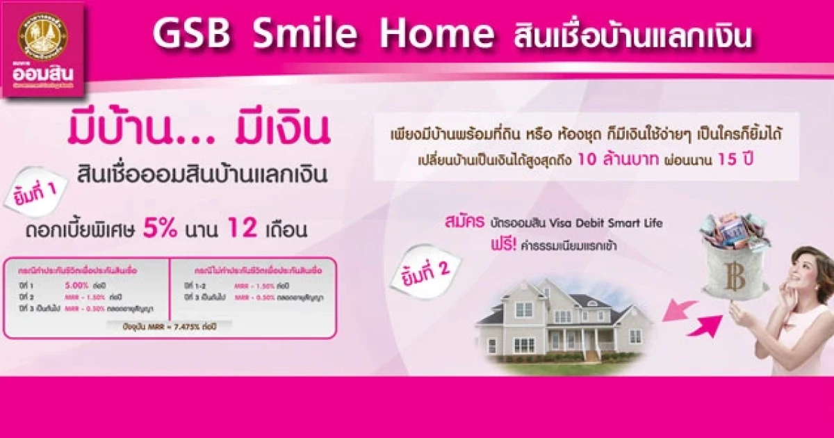 ยิ้มรับ 2 ต่อ เพียงนำบ้านมาเปลี่ยนเป็นเงิน กับสินเชื่อบ้านแลกเงิน GSB Smile Home