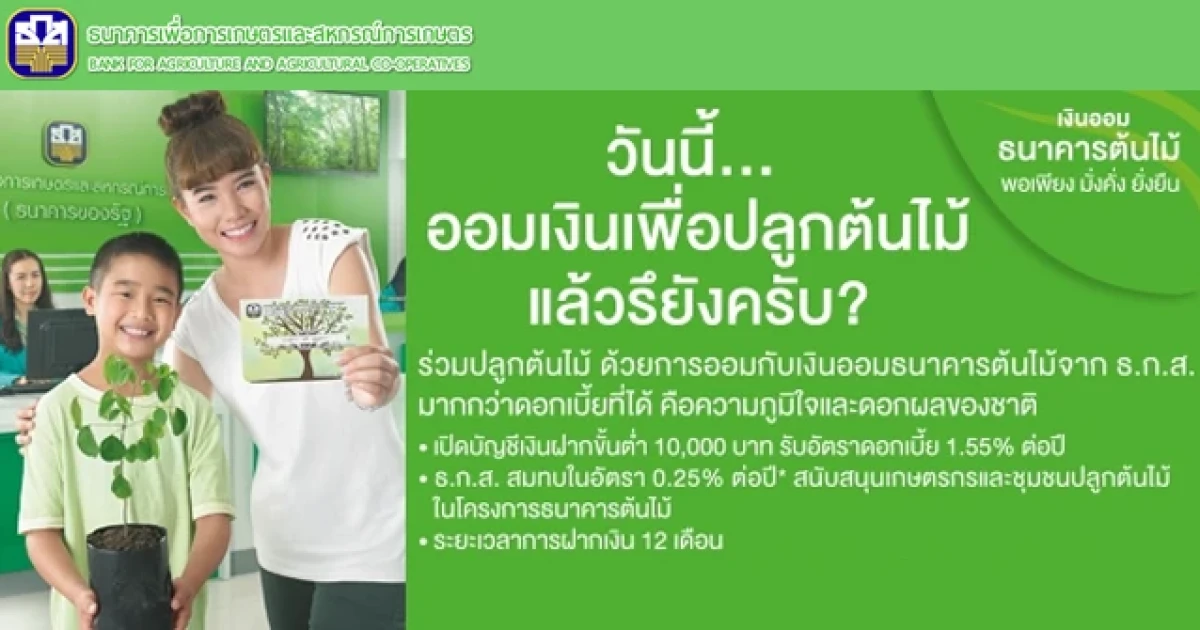 เงินออมธนาคารต้นไม้ พอเพียง มั่งคั่ง ยั่งยืน ร่วมปลูกต้นไม้ ด้วยการออมเงิน มากกว่าดอกเบี้ยที่ได้ คือความภูมิใจและดอกผลของชาติ เปิดบัญชีครั้งแรกและฝากเพิ่มขั้นต่ำ 10,000 บาท ได้รับทั้งดอกเบี้ยเงินฝากและเงินสมทบจากธนาคาร ระยะเวลาการฝากเงิน 12 เดือน