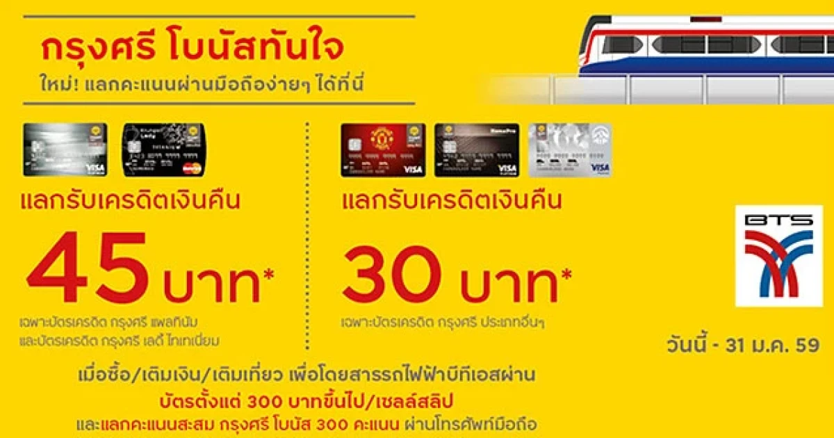 กรุงศรี โบนัสทันใจ แลกคะแนนรับเครดิตเงินคืน เมื่อซื้อ, เติมเงิน, เติมเที่ยวเพื่อโดยสารรถไฟฟ้าบีทีเอส ผ่านบัตรเครดิตกรุงศรี ตั้งแต่ 300 บาทขึ้นไป/ เซลล์สลิป หลังจากนั้นทำการแลกคะแนนสะสม กรุงศรี โบนัส 300 คะแนน ผ่านโทรศัพท์มือถือ
