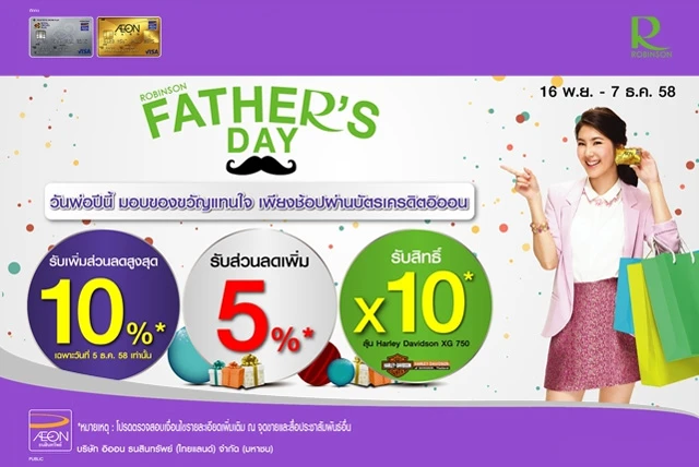 วันพ่อปีนี้ รับของขวัญแทนใจ 2 ต่อ พร้อมรับส่วนลดสูงสุดถึง 10% เพียงช้อปผ่านบัตรเครดิตอิออน ที่ห้างสรรพสินค้าโรบินสันทุกสาขา