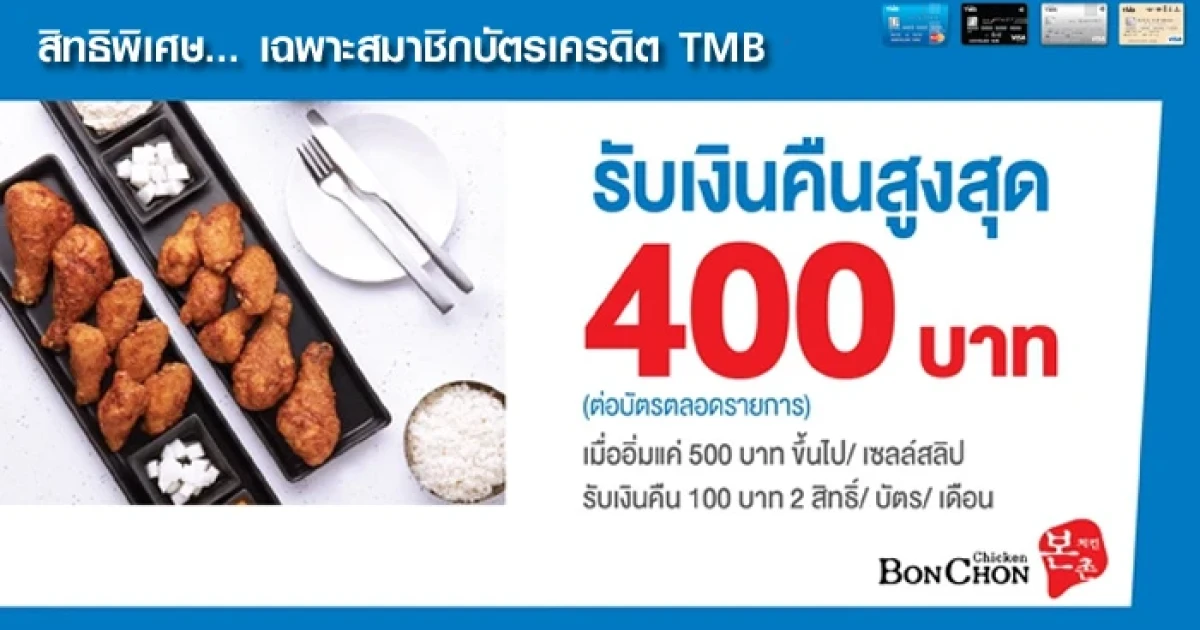 สิทธิพิเศษสำหรับสมาชิกบัตรเครดิต TMB รับเครดิตเงินคืนสูงสุด 400 บาท/บัตร ตลอดรายการ ที่ร้าน BonChon Chicken ทุกสาขา เพียงอิ่มอร่อย 500 บาทขึ้นไป/เซลส์สลิป รับเงินคืน 100 บาท (2 สิทธิ์/บัตร/เดือน)