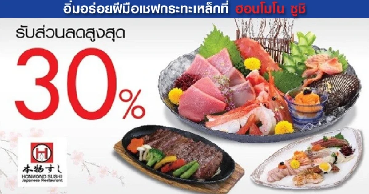 สิทธิพิเศษ สำหรับผู้ถือบัตรเครดิตธนาคารกรุงเทพ รับส่วนลด 2 ต่อ รวมสูงสุด 30% เมื่ออิ่มอร่อยฝีมือเชฟกระทะเหล็กที่ร้าน ฮอนโมโน ซูชิ