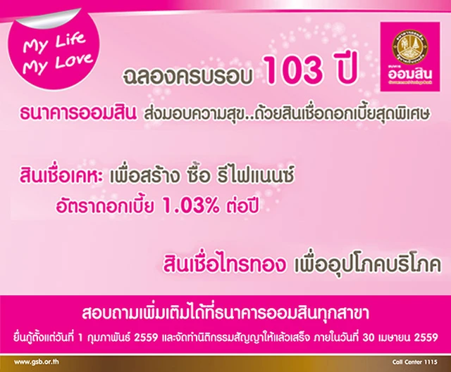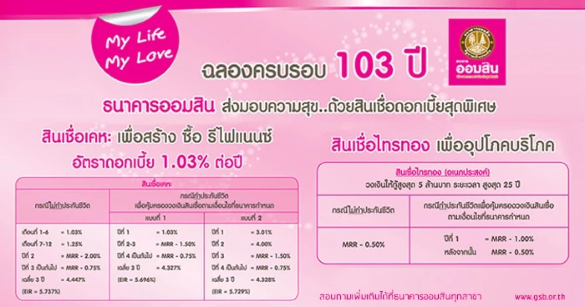 ธนาคารออมสินฉลองครบรอบ 103 ปี ส่งมอบความสุข ด้วยสินเชื่อดอกเบี้ยสุดพิเศษ ภายใต้แคมเปญ "My Life My Love" ให้กู้ดอกเบี้ยต่ำพิเศษ โดยสินเชื่อเคหะ อัตราดอกเบี้ยปีแรก 1.03% ต่อปี และ สินเชื่อไทรทอง อัตราดอกเบี้ยต่ำสุด MRR-1.00% ต่อปี พร้อมรับบัตรออมสิน เดบิต สมาร์ท แคร์ทันที สำหรับวงเงินกู้ 2.5 ล้านบาทขึ้นไป