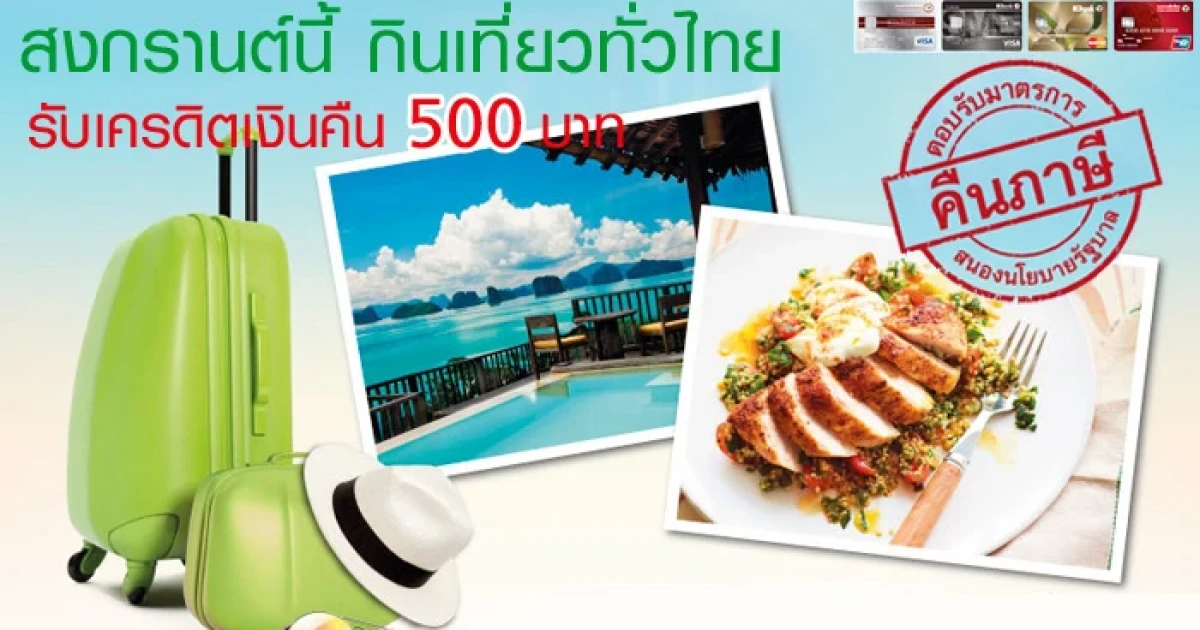 สงกรานต์นี้ กิน เที่ยว ทั่วไทย รับเครดิตเงินคืนสูงสุด 500 บาท เมื่อมียอดใช้จ่ายสะสมในหมวดโรงแรม และร้านอาหารครบ 20,000 บาทขึ้นไป จากบัตรเครดิตกสิกรไทย