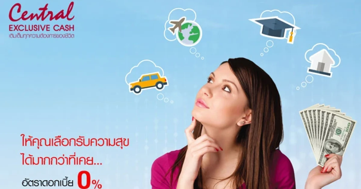 Central Exclusive Cash ให้คุณเลือกรับความสุขได้มากกว่าที่เคย ... อัตราดอกเบี้ย 0% นานสูงสุด 2 เดือน พร้อมสิทธิพิเศษเมื่อสมัครวันนี้ รับข้อเสนอสุดพิเศษ