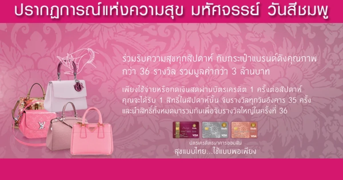 ปรากฎการณ์แห่งความสุข มหัศจรรย์ วันสีชมพู... สิทธิพิเศษสำหรับผู้ถือบัตรเครดิตธนาคารออมสิน ลุ้นรับกระเป๋าแบรนด์เนมดังคุณภาพ รวมทั้งสิ้น 36 รางวัล รวมมูลค่ากว่า 3 ล้านบาท เพียงถอนเงินสดด้วยบัตรเครดิตผ่านเครื่อง ATM หรือชำระค่าสินค้าและบริการด้วยบัตรเครดิตธนาคารออมสิน ผ่านเครื่อง EDC จะได้รับ 1 สิทธิ์ ในสัปดาห์นั้น