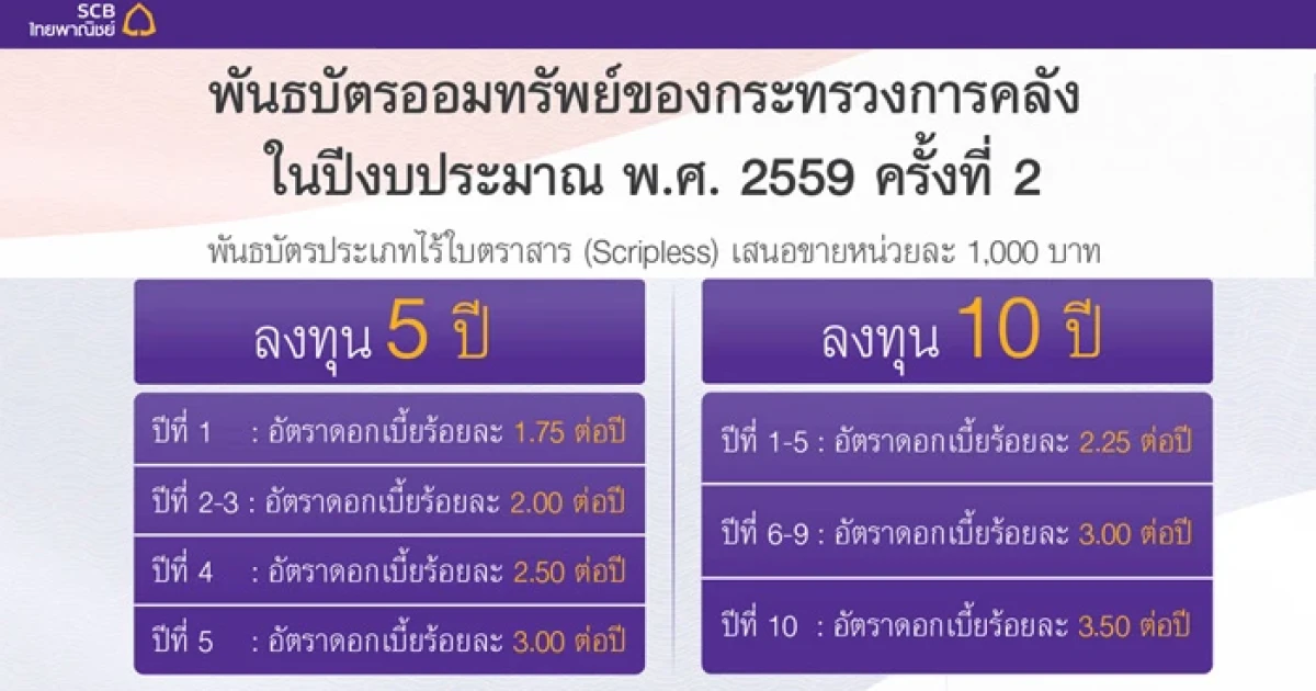ธนาคารไทยพาณิชย์ เปิดจำหน่ายพันธบัตรออมทรัพย์ของกระทรวงการคลัง ในปีงบประมาณ พ.ศ. 2559 ครั้งที่ 2 แบบไร้ตราสาร (Scripless) เสนอขายหน่วยละ 1,000 บาท