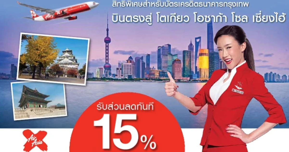สิทธิพิเศษสำหรับผู้ถือบัตรเครดิตธนาคารกรุงเทพ รับส่วนลดสูงสุด 15% เมื่อซื้อตั๋วเครื่องบิน เส้นทางไปโตเกียว โอซาก้า โซล และเซี่ยงไฮ้ กับสายการบิน ไทย แอร์ เอเชีย เอ็กซ์ ในราคาปกติ ผ่าน Call Center ของ AirAsia โทร. 02-515-9999