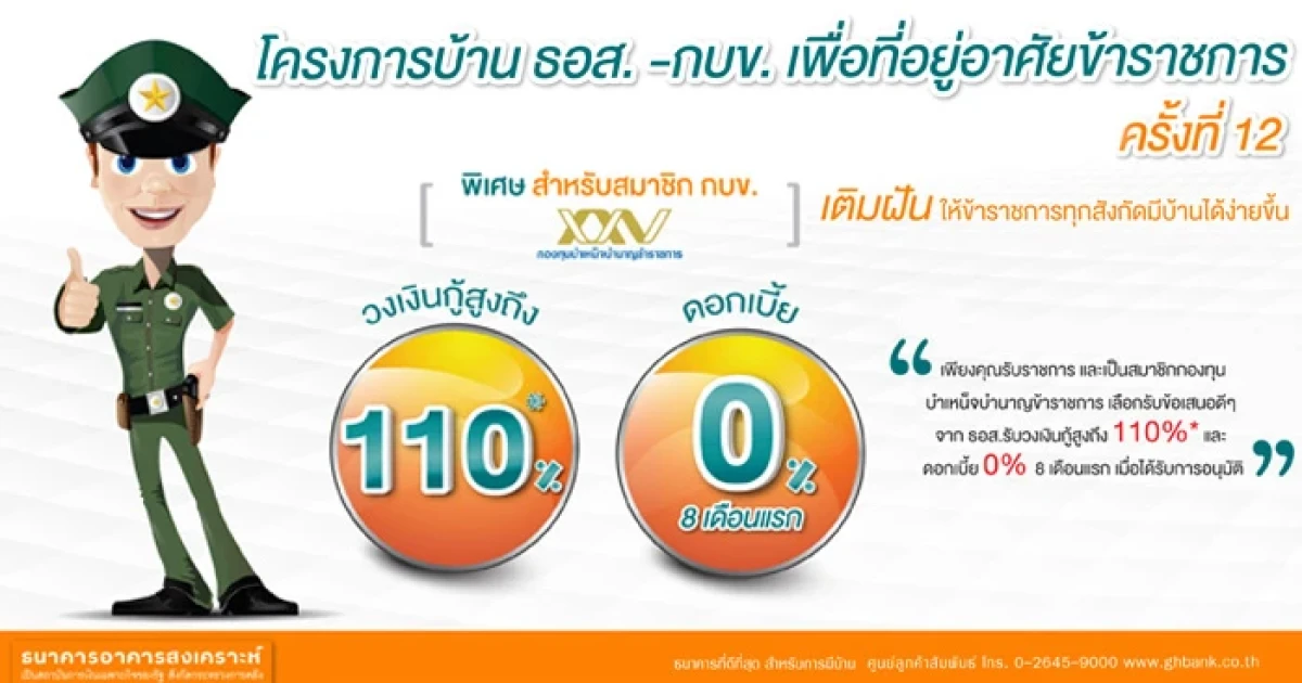 โครงการบ้าน ธอส.- กบข. เพื่อที่อยู่อาศัยข้าราชการ ครั้งที่ 12 เติมฝันให้ข้าราชการทุกสังกัดมีบ้านได้ง่ายขึ้น พิเศษสำหรับสมาชิก กบข. ให้วงเงินกู้สูงถึง 110% และอัตราดอกเบี้ย 0% 8 เดือนแรก