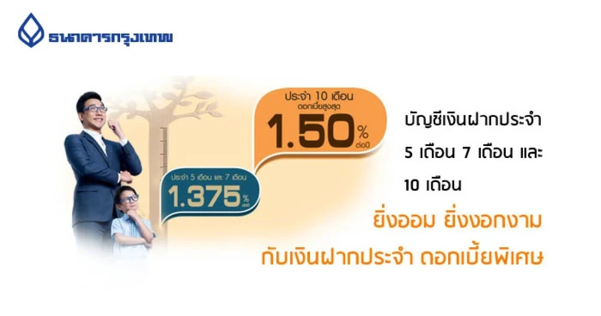 เลือกออมได้อย่างมั่นใจกับบัญชีเงินฝากประจำ 5 เดือน 7 เดือน และ 10 เดือน รับฝากตั้งแต่ 100,000 บาทขึ้นไป ที่ธนาคารกรุงเทพทุกสาขา