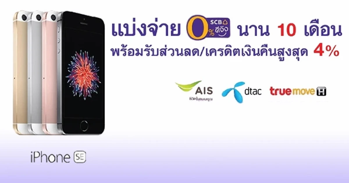 แบ่งจ่าย iPhone SE กับบริการ SCB ดีจัง 0% นาน 10 เดือน พร้อมรับส่วนลด หรือเครดิตเงินคืนสูงสุด 4% ณ ร้านค้าที่ร่วมรายการ จาก บัตรเครดิตไทยพาณิชย์ (จำกัดเครดิตเงินคืนสูงสุด 3,000 บาท/ท่าน ตลอดรายการ)