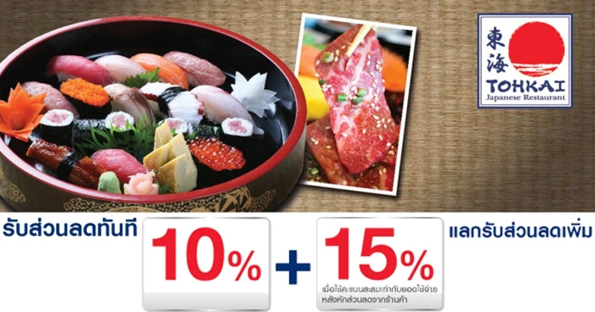 รับส่วนลดทันที 10% เมื่อรับประทานอาหารที่ร้าน TOHKAI Japanese Restaurant และชำระผ่านบัตรเครดิตยูโอบี แลกรับส่วนลดเพิ่ม 15% เมื่อใช้คะแนนสะสมเท่ากับยอดใช้จ่าย หลังหักส่วนลดจากร้านค้าแล้ว