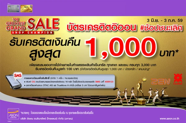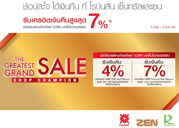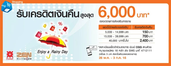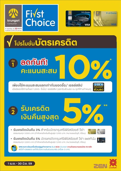 รายละเอียดโปรโมชั่น : รับเครดิตเงินคืนสูงสุด 1,000 บาท เมื่อมียอดใช้จ่ายสะสมผ่านบัตรทุกๆ 3,000 บาท ที่ห้างสรรพสินค้าเซ็นทรัลทุกสาขา และ ZEN (จำกัด 1,000 บาท/ บัญชี ตลอดรายการ)