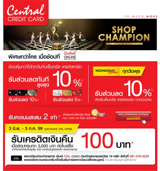- ต่อที่ 2 รับส่วนลด 10% ทุกวันพุธ สำหรับเซ็นทรัล เครดิตคาร์ด ทุกหน้าบัตร