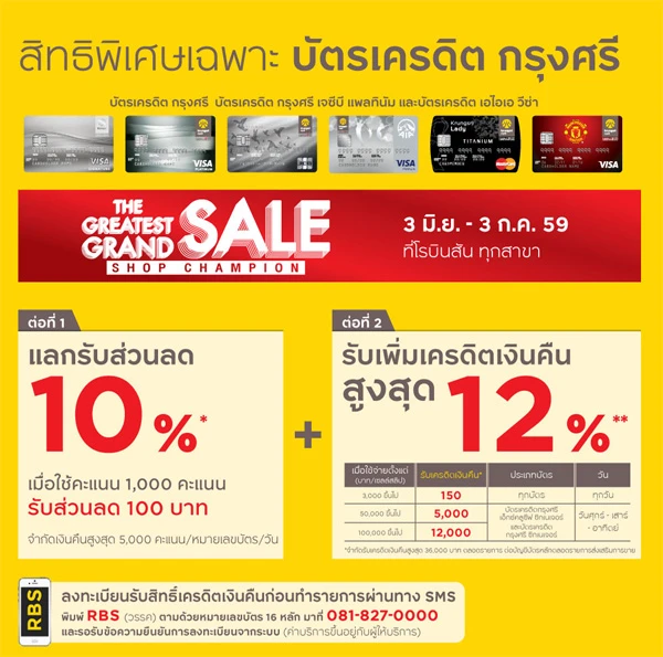 - รับเครดิตเงินคืน 12,000 บาท เมื่อช้อปตั้งแต่ 100,000 บาทขึ้นไป/ เซลล์สลิป สำหรับบัตรเครดิตกรุงศรี เอ็กซ์คลูซีฟ ซิกเนเจอร์ และบัตรเครดิตกรุงศรี ซิกเนเจอร์ เฉพาะวันศุกร์, เสาร์ และอาทิตย์