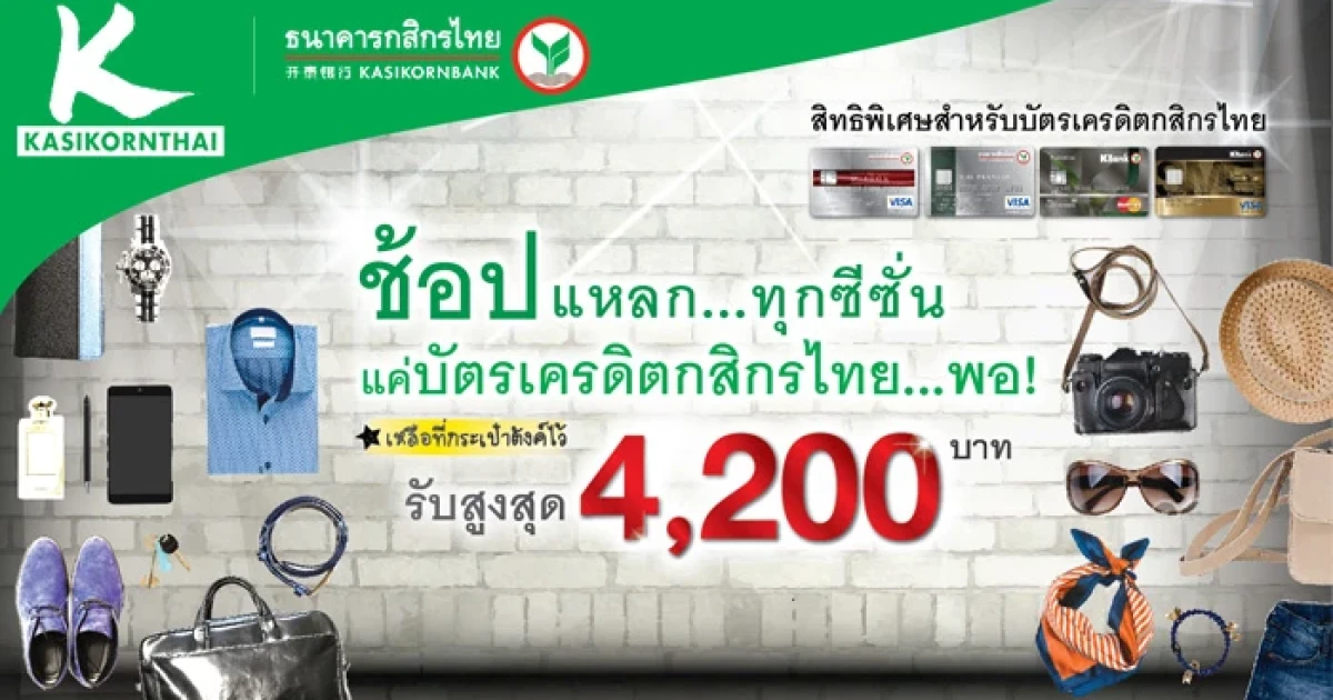 ช้อปแหลก.. ทุกซีซั่น รับเงินคืนสูงสุด 4,200 บาท พร้อมใช้คะแนนสะสม Kbank Reward Point แลกรับส่วนลดสูงสุด 13% ที่ห้างสรรพสินค้าชั้นนำ ที่ร่วมรายการ จาก บัตรเครดิตกสิกรไทย