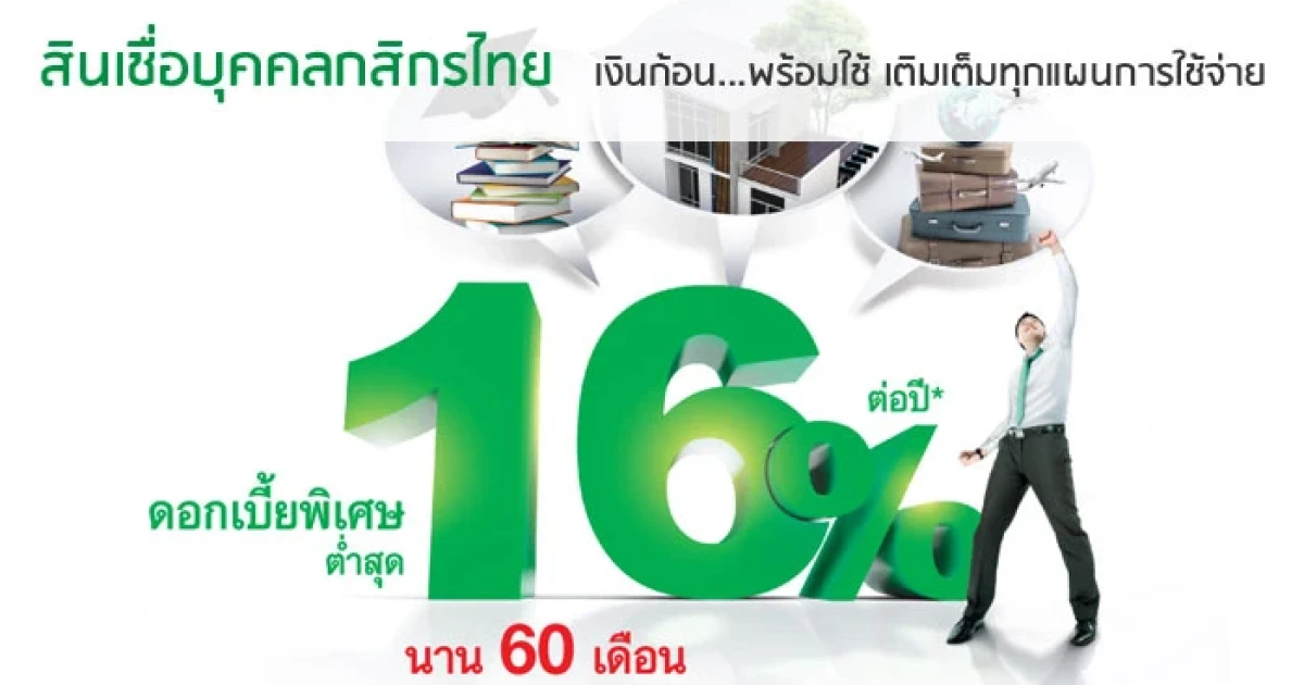 สินเชื่อบุคคลกสิกรไทย K-Personal Loan เงินก้อน...พร้อมใช้ เติมเต็มทุกแผนการใช้จ่าย ให้ดอกเบี้ยพิเศษต่ำสุด 16% ต่อปี นาน 60 เดือน