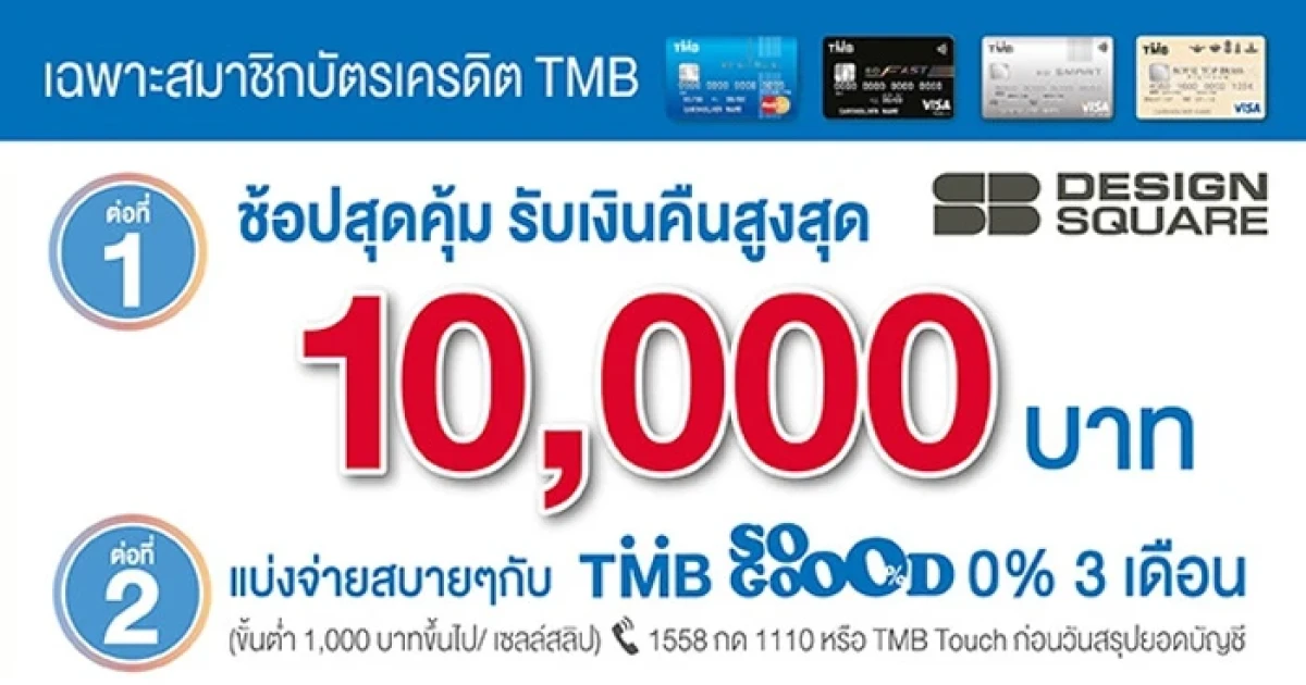 ช้อปสุดคุ้ม รับเครดิตเงินคืนสูงสุด 10,000 บาท เมื่อใช้จ่ายตามยอดที่ธนาคารฯ กำหนด หรือแบ่งจ่ายสบายๆ 0% นาน 3 เดือน ที่ SB Design Square กับบัตรเครดิต TMB