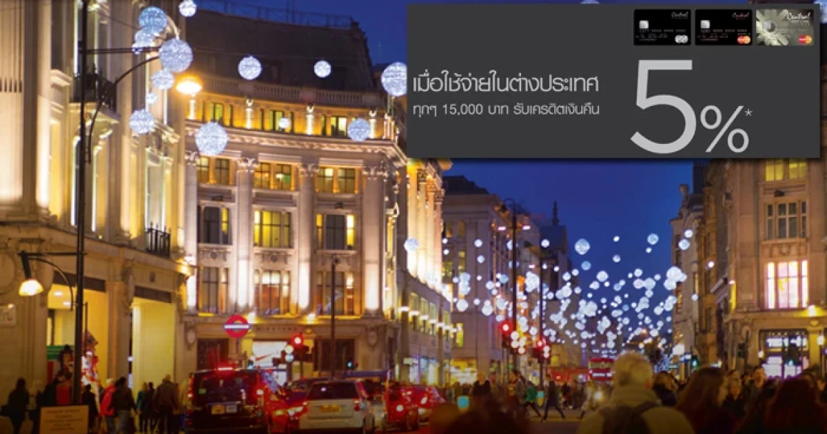 รับเครดิตเงินคืนสูงสุด 5% เมื่อใช้จ่ายที่ต่างประเทศ ทุกๆ 15,000 บาทขึ้นไป/ เซลล์สลิป สิทธิพิเศษเฉพาะสำหรับสมาชิกบัตรเซ็นทรัล เครดิตคาร์ด (จำกัดเครดิตเงินคืน 3,000 บาท สำหรับบัตรเซ็นทรัล เดอะแบล็ค, เซ็นทรัล แบล็ค และจำกัดเครดิตเงินคืน 2,250 บาท สำหรับเซ็นทรัล เครดิตคาร์ด แพลทินัม)