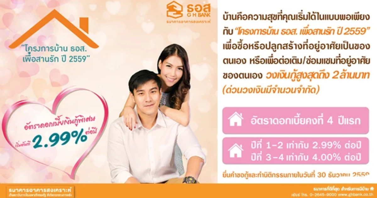 โครงการบ้าน ธอส. เพื่อสานรัก ปี 2559 ส่งเสริมให้ผู้มีรายได้น้อยถึงปานกลางสามารถเข้าถึงแหล่งเงินกู้เพื่อซื้อที่อยู่อาศัยเป็นของตนเอง อัตราดอกเบี้ยเงินกู้พิเศษ เริ่มต้นที่ 2.99% ต่อปี วงเงินกู้สูงสุด 2 ล้านบาท