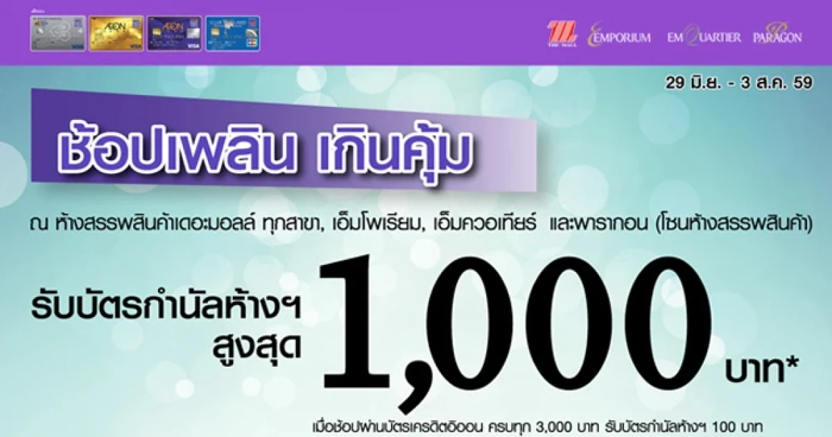 ช้อปเพลิน เกินคุ้ม! รับบัตรกำนัลสูงสุด 1,000 บาท เมื่อช้อปสินค้าครบทุก 3,000 บาท/ เซลล์สลิป รับบัตรกำนัลจำนวน 1 ใบ มูลค่า 100 บาท ณ ห้างสรรพสินค้าเดอะมอลล์ ทุกสาขา, เอ็มโพเรียม, เอ็มควอเทียร์ และพารากอน (โซนห้างฯ) ผ่านบัตรเครดิตอิออน (จำกัดการแลกรับบัตรกำนัลสูงสุด 10 ใบ/ บัตร/ วัน)